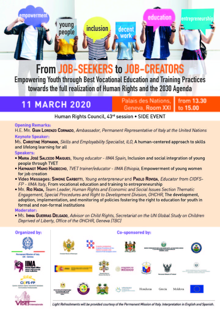 Un grande evento ci attendeva oggi, 11 marzo, al Palazzo delle Nazioni Unite di Ginevra, all’interno della 43ª sessione di lavoro del Consiglio per i Diritti Umani. Organizzato dall’Ufficio Diritti Umani delle Salesiane di Don Bosco, da CIOFS-FP e dalla Missione permanente d’Italia, l’evento trattava un tema molto importante per la Formazione Professionale: “From Job-seekers to Job-creators: Empowering Youth through Best Vocational Education and Training Practices towards the full realization of Human Rights and the 2030 Agenda” (Dal cercare lavoro al creare opportunità lavorative: l’empowerment di adolescenti e giovani nei Centri di Formazione professionale).